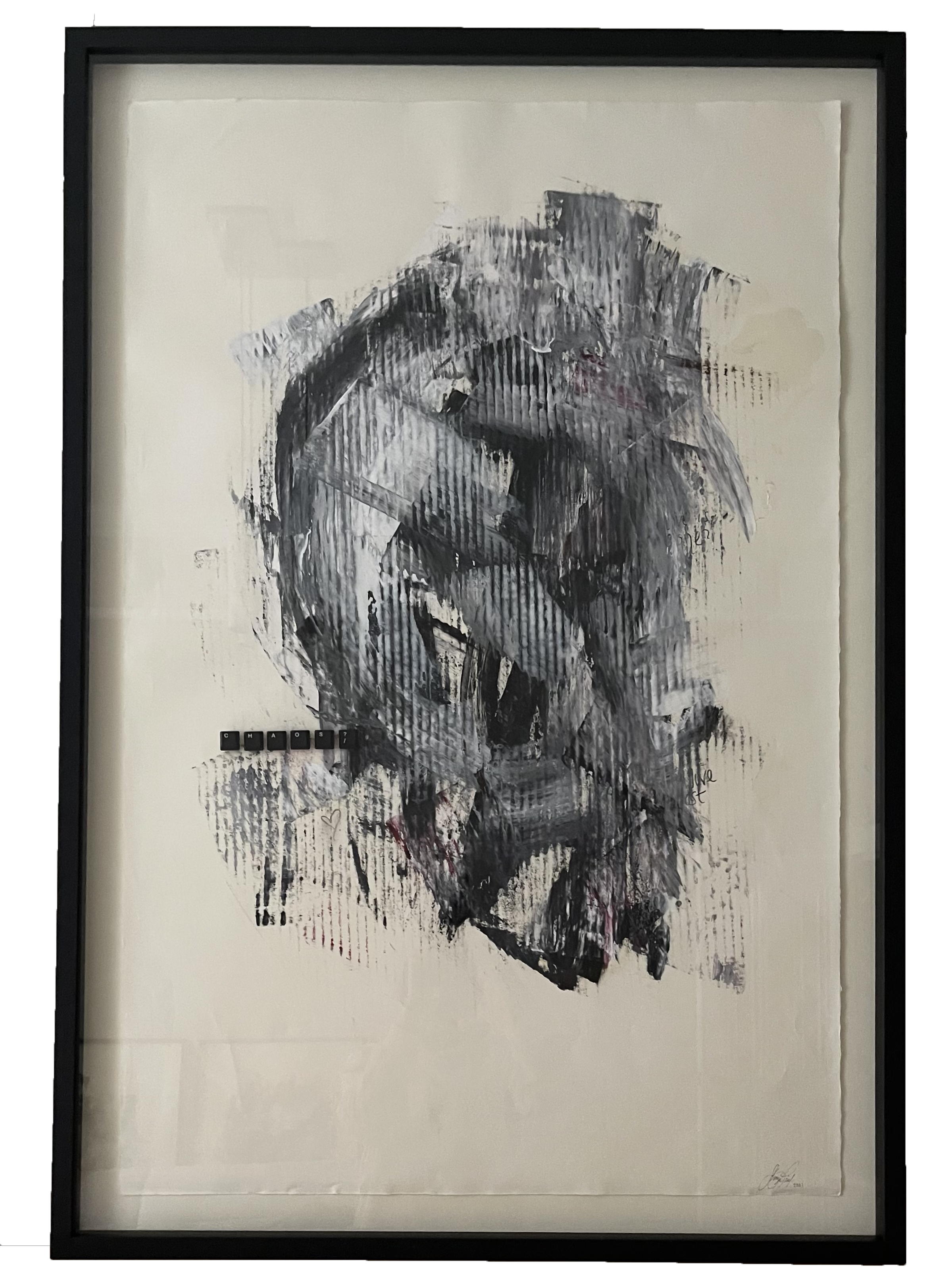 SOLD "bye.", 35x45" framed, oil paint, charcoal, graphite, computer keys and burned paper on BFK rives special made paper